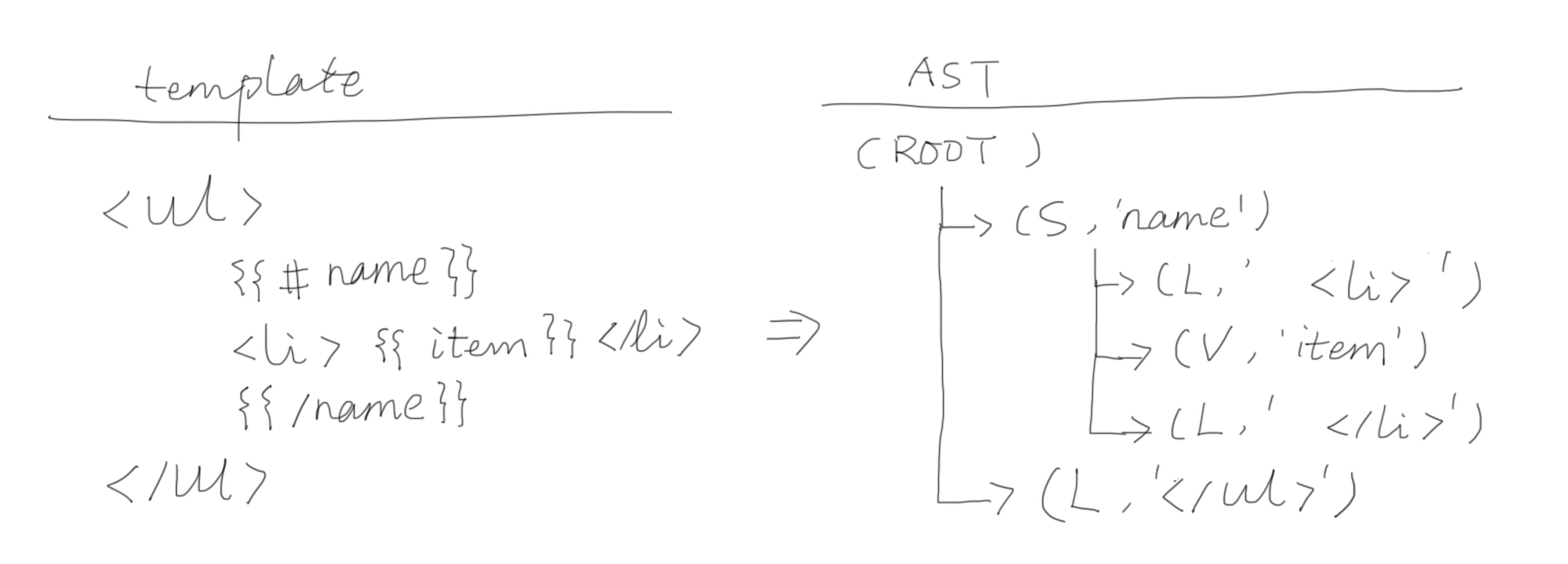 如前文所述,我们实现的模板引擎需要包括一个编译器,以及一个虚拟机,我们选择抽象语法树作为中间表示。下图是一个图示:
