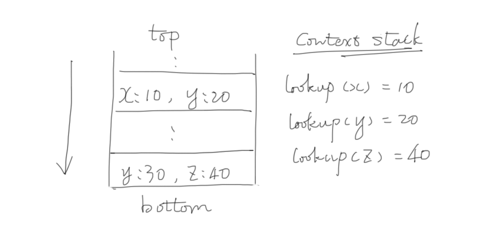 另一个函数是查找(lookup),在给定的上下文栈中查找对应的变量。