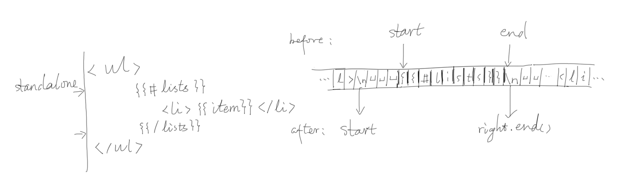 Mustache 中有“单独行”(standalone)的概念,即如果一个标签所在的行,除了该标签外只有空白字符,则称为单独行。判断函数如下: