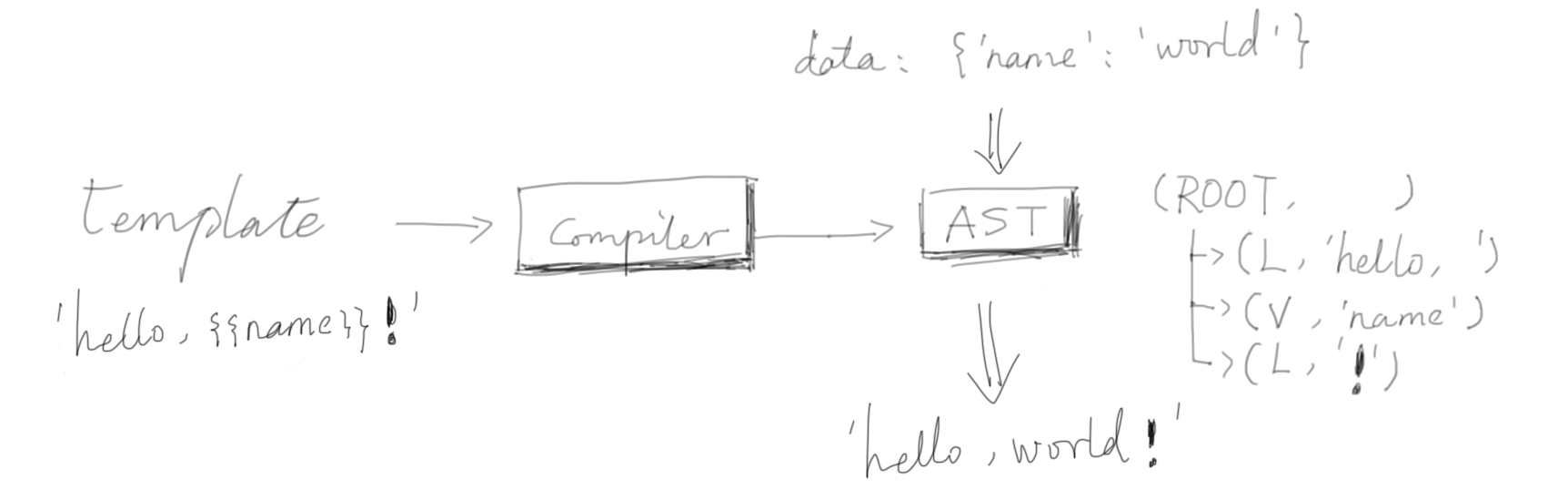 本质上,模板引擎的工作就是将模板转换成一个内部的结构,可以是抽象语法树(AST),也可以是 python 代码,等等。同时还需要是一个虚拟机,能够理解这种内部结构,给出我们需要的结果。