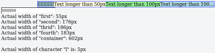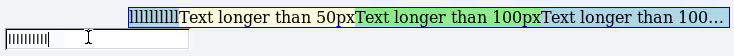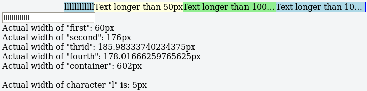 如果在输入框中输入,可以看到:当宽度不足时,三个子元素一起收缩,出现 ... 字样。这是因为,flex 元素的子元素的默认 flex 设置为 flex: 0 1 auto。即收缩的比值为 1。
