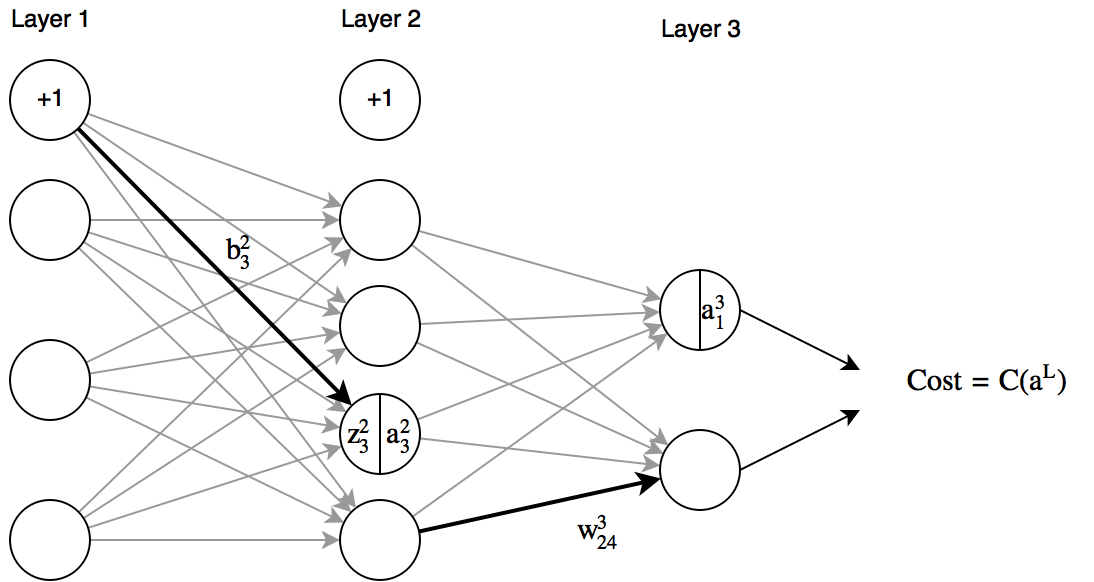 - $z_j^l$ 表示第 $l$ 层的第 $j$ 个节点的加权输入,即 $z_j^l \equiv \sum_k{w_{kj}^l a_k^{l-1}} + b_j^l$