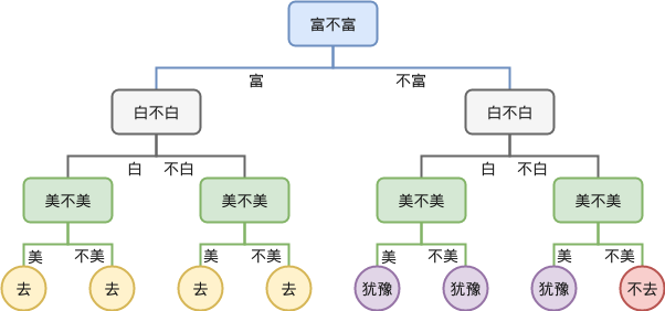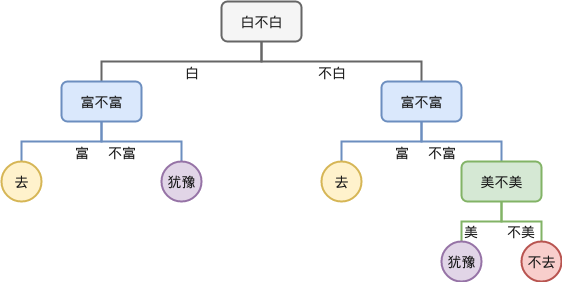 如果仔细观察,我们发现决策树中有一些叶子节点是可以合并的,合并之后,到达某个节点时就不需要进行额外的决策,例如切分顺序“白,富,美”得到的决策树合并后如下: