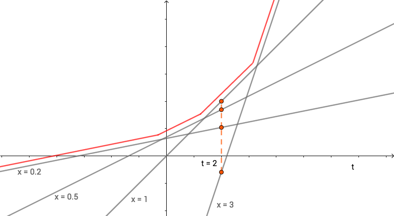 注意到 $f^*(t)$ 的定义为当 t 取某个值时,所有 $g(t)$ 的最大值。例如上图中,当 $t = 2$ 时,它与各直线的交点即为 $g(t)$ 的值,所以 $f^*(t)$ 的取值就是图点最高的点的值。
