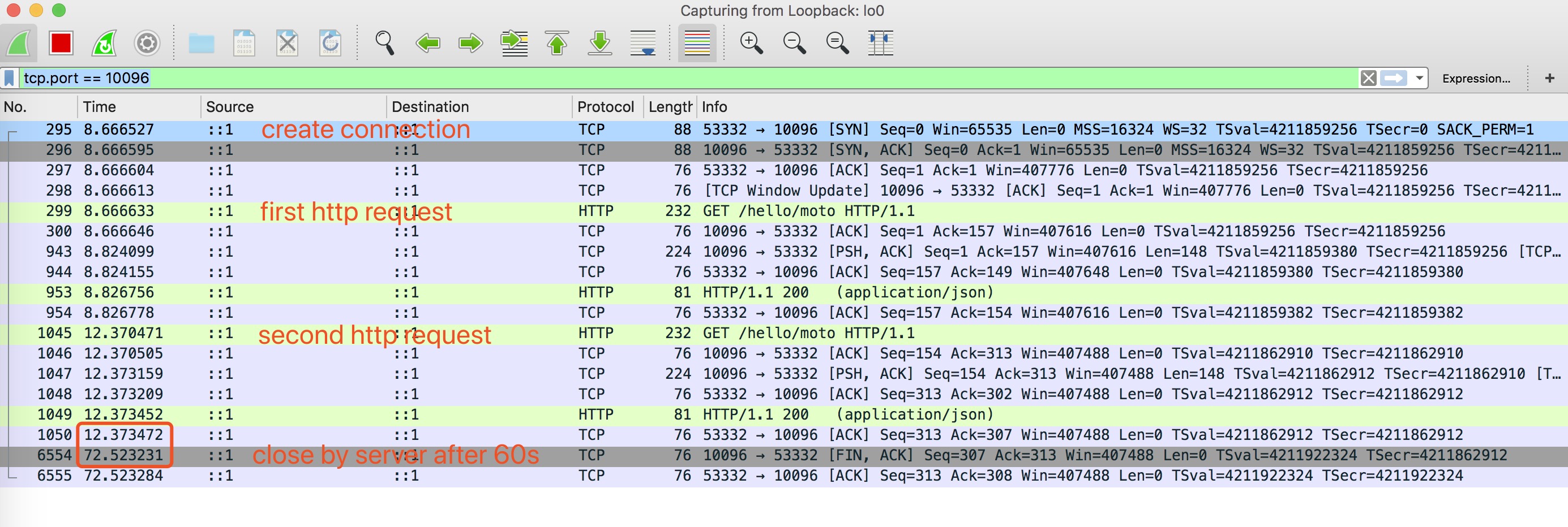 抓包之下,再复杂的逻辑也将显露无疑。我们使用 Wireshark 抓包,看到使用了 keep-alive 的请求如下: