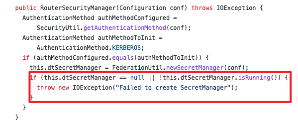 RouterSecurityManager并没有对 secret manager 的启动状态做校验(后续版本修复),仍然继续运行 - 在实际创建 delegation token 时,由于 secret manager 的状态异常,创建的请求也失败