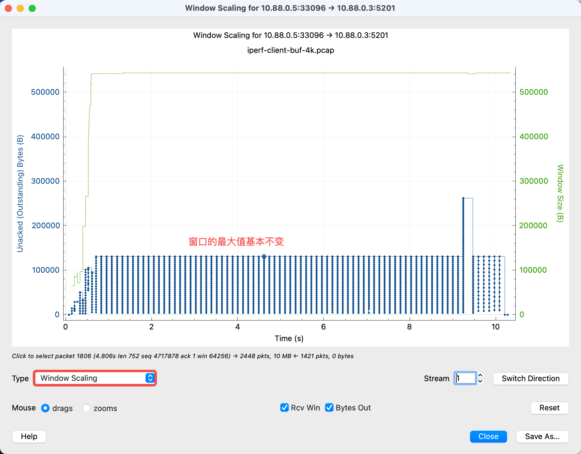 简单理解 Windown Scaling 里计算的是每个包对应的 “Bytes In Flight” 的数据,也就是“发出但未被 ACK”的数据,通常这个信息可以认为约等于发送方的 cwnd。但是上图中这个窗口信息很“平”,而一般 cwnd 是会波动的,因此可以认为不是 cwnd 引起的,那么就只能是发送窗口了。作为对比,我们看一个不显式设置 send buffer 的示例: